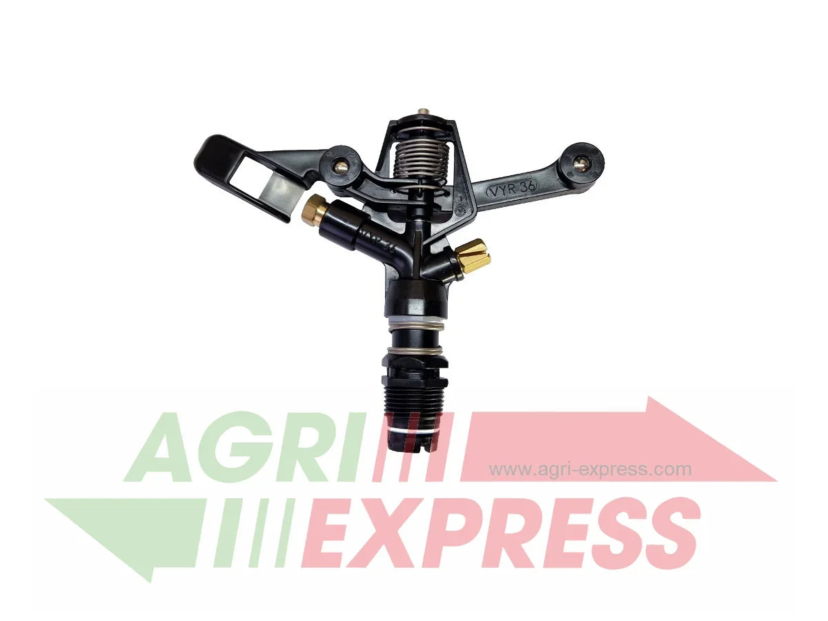 Model VYR-36 jest zraszaczem z tworzywa sztucznego i jest uważany jako zraszacz o średnim przepływie z przyłączem męskim 3/4". Z dwiema dyszami, dysza główna 25° i dysza tylna również 25°, ale ze szczeliną o małym promieniu.